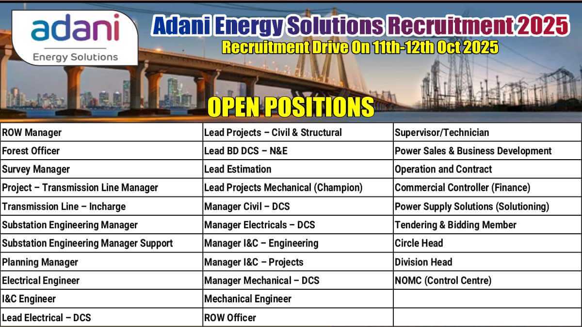 Adani Energy Solutions Recruitment 2025 | Transmission, DCS & Smart Metering Jobs | Recruitment Drive On 11th-12th Oct 2025