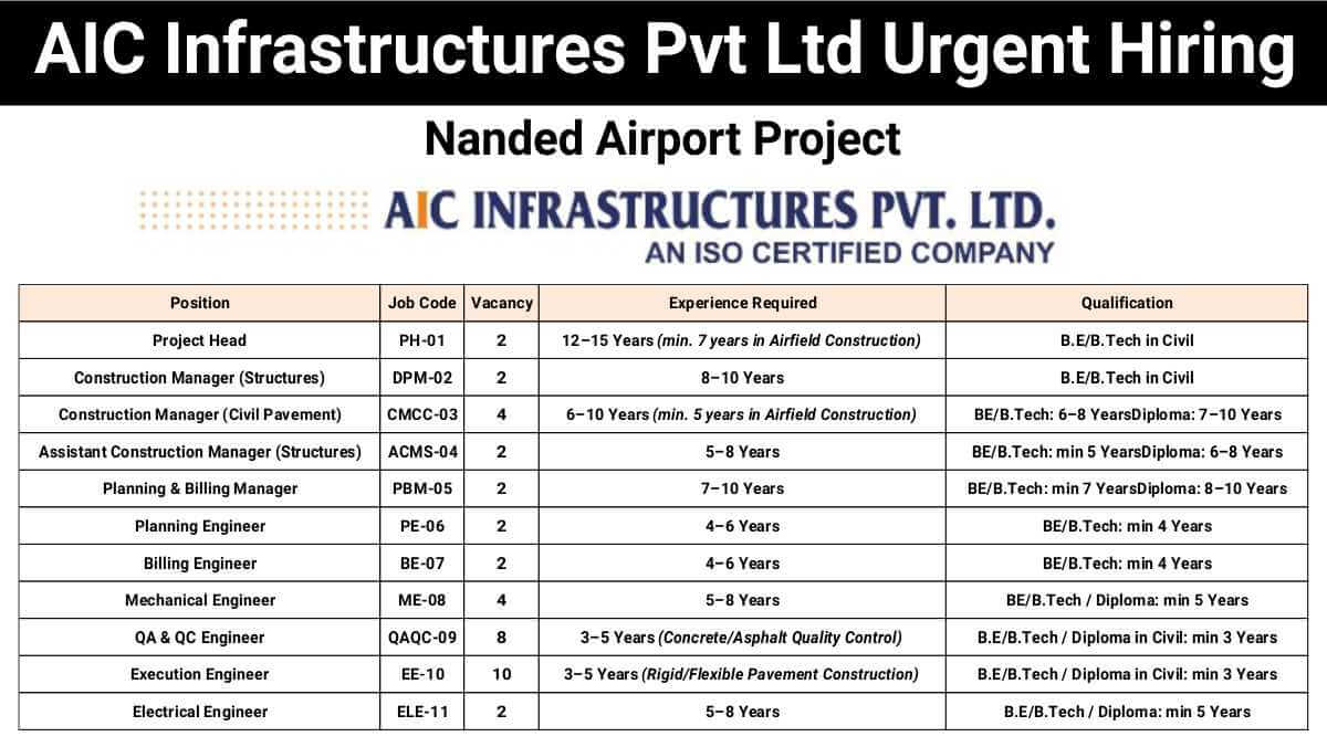AIC Infrastructures Pvt. Ltd. is a leading infrastructure construction company specializing in airfield, civil, and structural development projects. With a proven record of excellence and compliance with international standards, AIC delivers quality-driven solutions across airports, highways, metro, and industrial projects. The company is now hiring qualified professionals for its Nanded Airport Project.