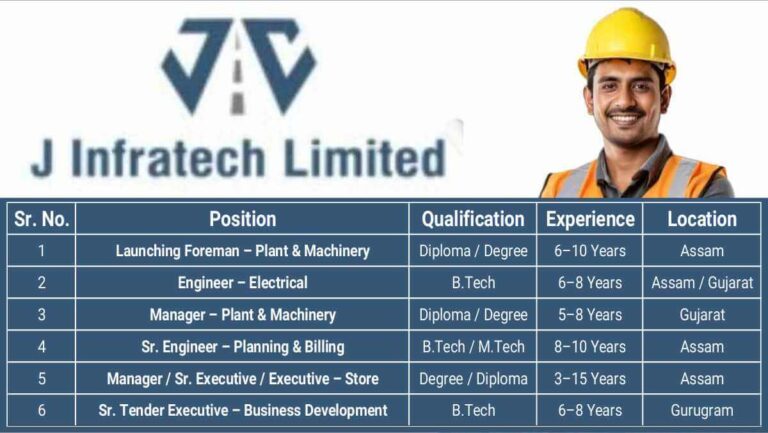 J Infratech Recruitment 2025 | Civil, Electrical & Plant Machinery Jobs | Jobs in Assam, …