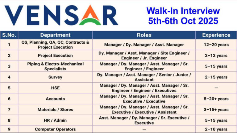 Vensar Constructions Jobs 2025 | Civil Mechanical Electrical Engineer Careers | Walk-In Interview Indore 5th-6th …