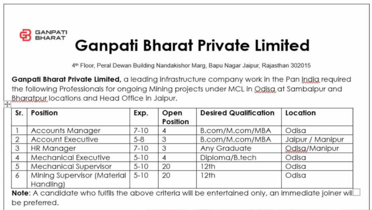 Ganpati Bharat Pvt Ltd Hiring 2025 | For Mining Project | Jobs in Jaipur & …