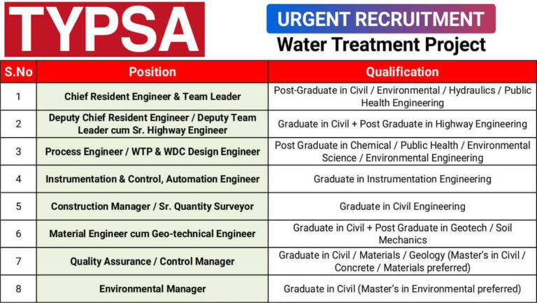 Typsa India Ltd Urgent Recruitment | For Water Treatment Project Jobs India | Civil Engineer …