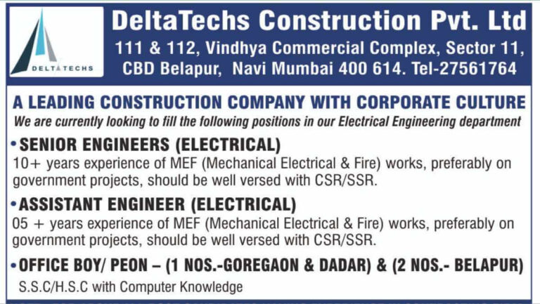 DeltaTechs Construction Pvt Ltd Hiring 2025 | Electrical Engineers Wanted Company Name DeltaTechs Construction Pvt …