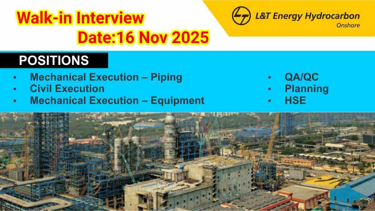L&T Energy Hydrocarbon Jobs | Walk-in for Civil, Mechanical, QA/QC & HSE | Oil & Gas Site
