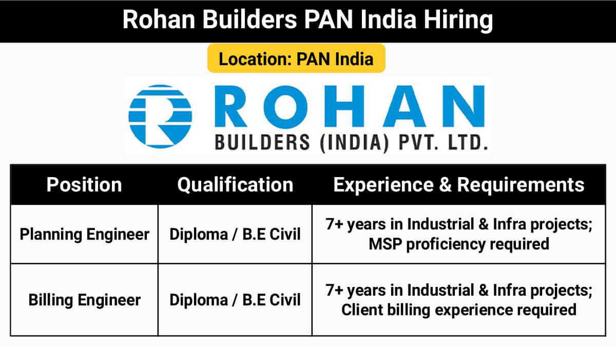 Rohan Builders PAN India Hiring | Planning Engineer & Billing Engineer Roles | Civil Engineering Jobs