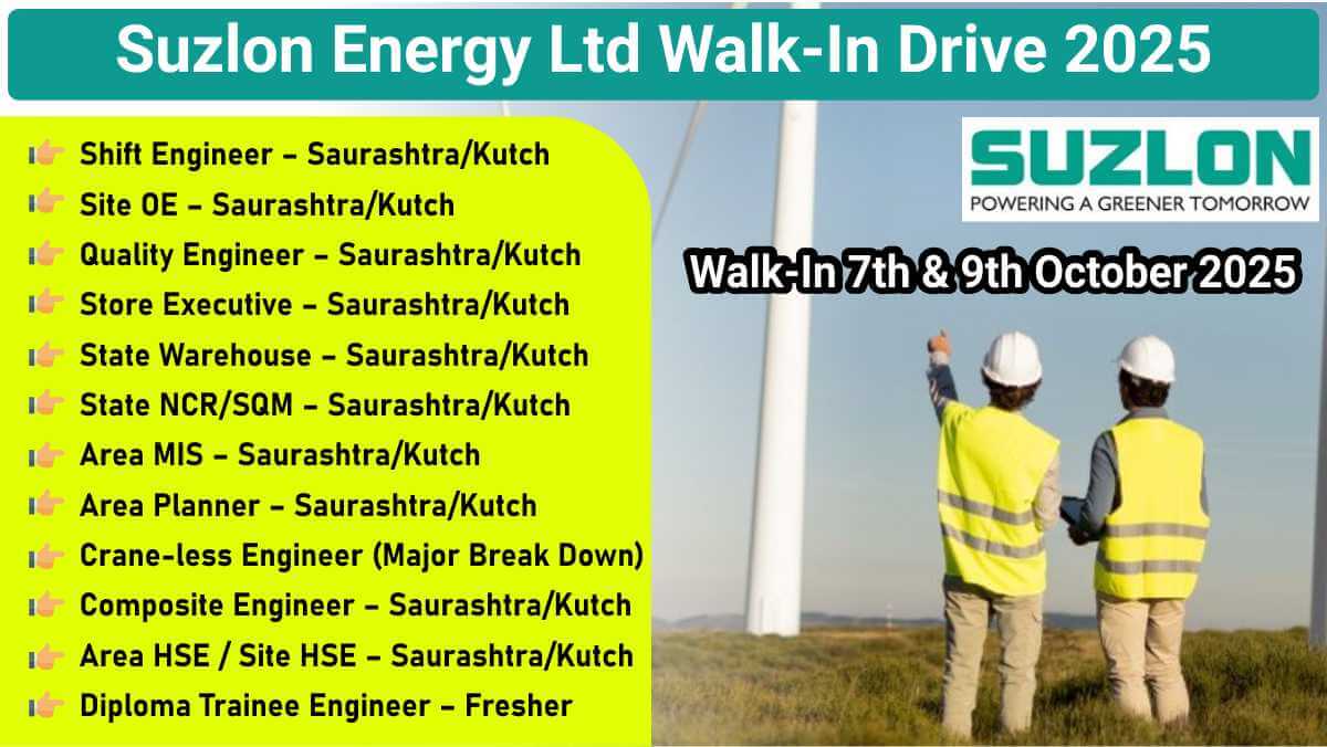 Suzlon Energy Ltd Walk-In Drive 2025 | Fresher & Experienced Openings | Jaipur & Udaipur Walk-In 7th & 9th October 2025