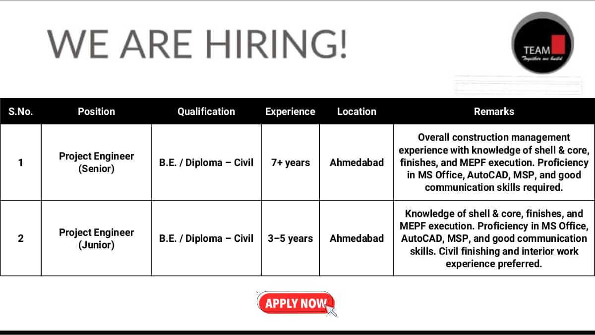 TEAM PMC Urgent Hiring 2025 | Project Engineer Openings | Civil Jobs in Ahmedabad