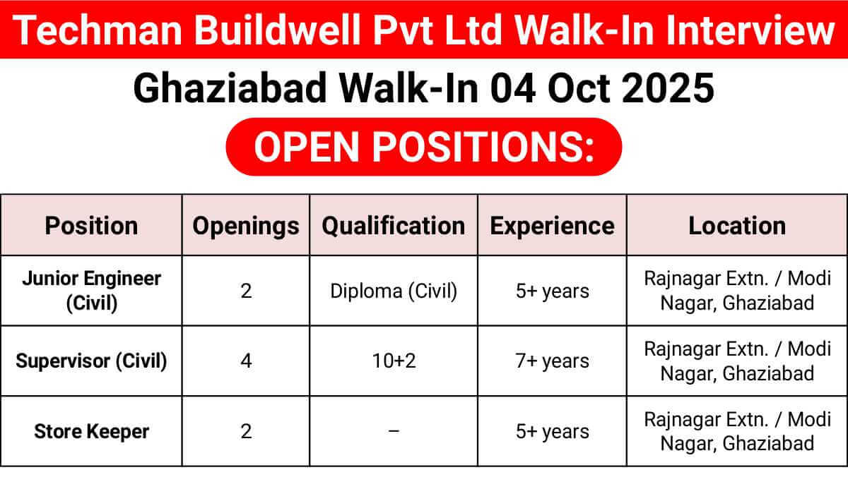Techman Buildwell Pvt Ltd Walk-In Interview | Civil Construction Jobs for High-Rise Projects | Ghaziabad Walk-In 04 Oct 2025